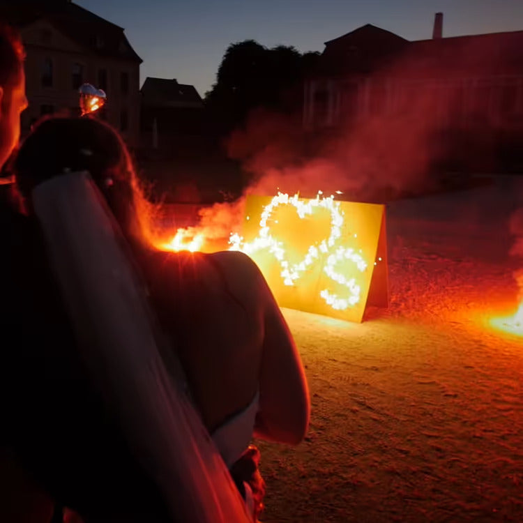 Unser Lichterbild Brennendes Herz mit zwei Buchstaben besteht aus insgesamt drei Tafeln und bildet ein Herz umrandet von zwei Buchstaben Ihrer Wahl ab. Häufig verwendet werden hier die Anfangsbuchstaben des Paares, für das das Herz gedacht ist. Das Brennende Herz mit Buchstaben ist ein kleines 60 sekündiges Feuerwerk, welches ohne behördliche Genehmigung gezündet werden darf. Ein ideales Hochzeitsgeschenk oder eine ganz besondere Überraschung für eine Liebeserklärung.