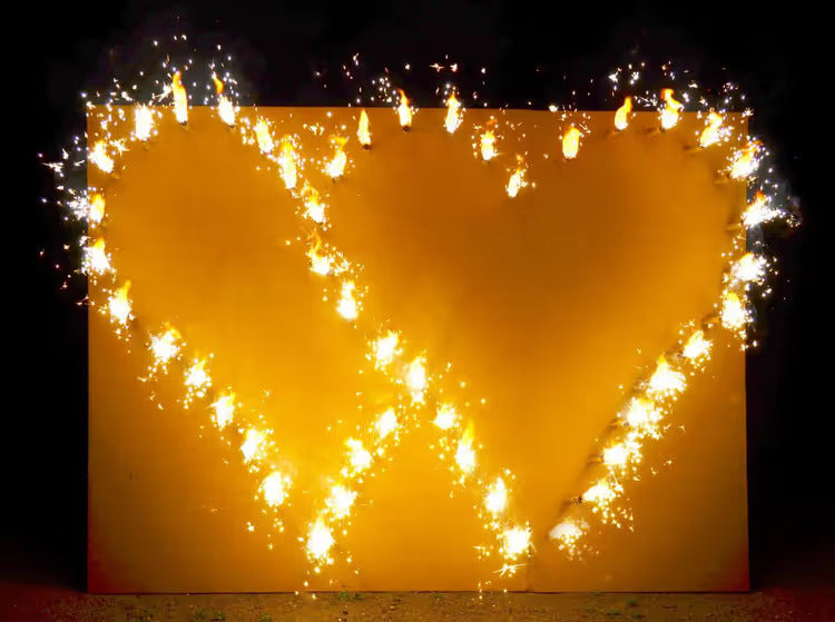 Das Lichterbild "Doppelherz" wird an drei Stellen gezündet und die pyrotechnisch untereinander verbundenen Fontänen brennen gleichzeitig an.