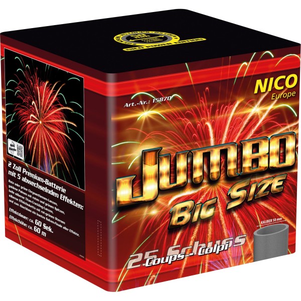 Großkalibrige Kugelbomben-Batterie mit 5 abwechselnden Effekten: Rote Chrysanthemen-Lanzen, grüne Chrysanthemen-Lanzen, goldene Glitzerranken mit roten und grünen Spitzen, helle silberne Crackling-Lanzen oder silberne Effektbuketts mit roten und grünen Sternen, endend mit einem bunten Finale aus 5 Schüssen.