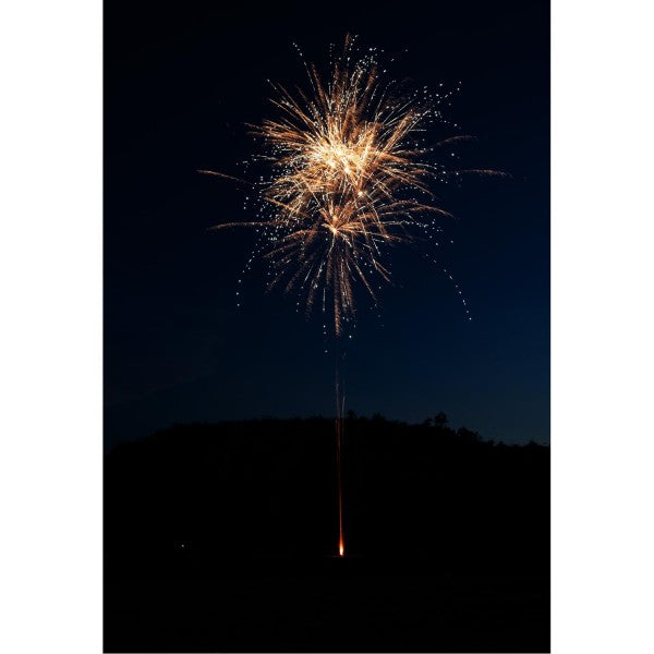 Salvenbatterie mit 25 Schuss. Fünf 5er-Salven mit goldenem Kometenaufstieg und Verwandlung zu glitzernden Goldbrokat-Effekten.